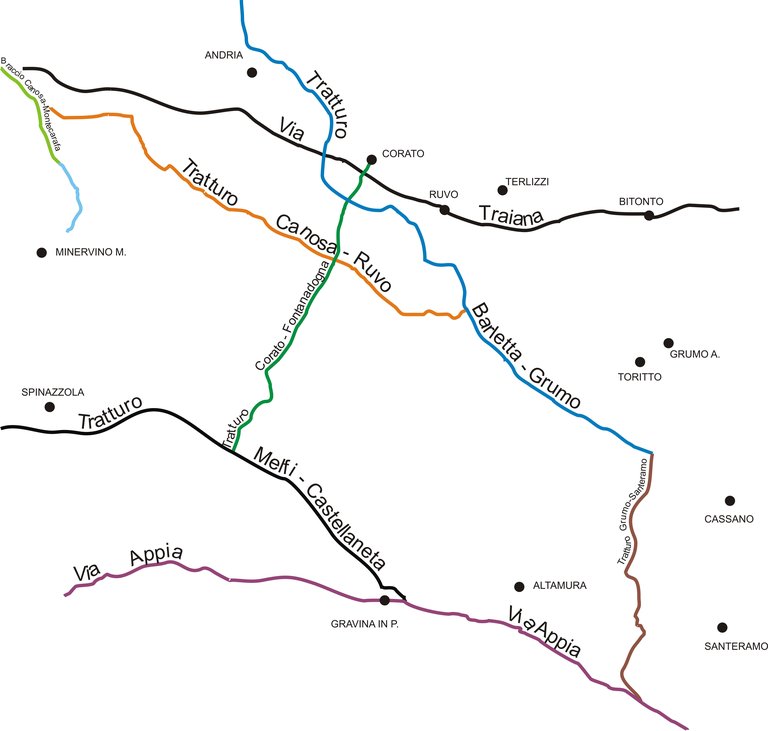 In particolare, è possibile vedere il Tratturo Barletta-Grumo, il Tratturello Canosa-Ruvo, il Tratturo Melfi-Castellaneta, il Tratturello Montecarafa-Minervino, il Tratturello Corato-Fontanadogna, il Tratturello Grumo Appula-Santeramo in Colle, il Tratturello Via Traiana e, ovviamente, il percorso antico della via Appia, il che denota come questo territorio sia stato molto più popolato rispetto al paesaggio desolato e disabitato che sembra.